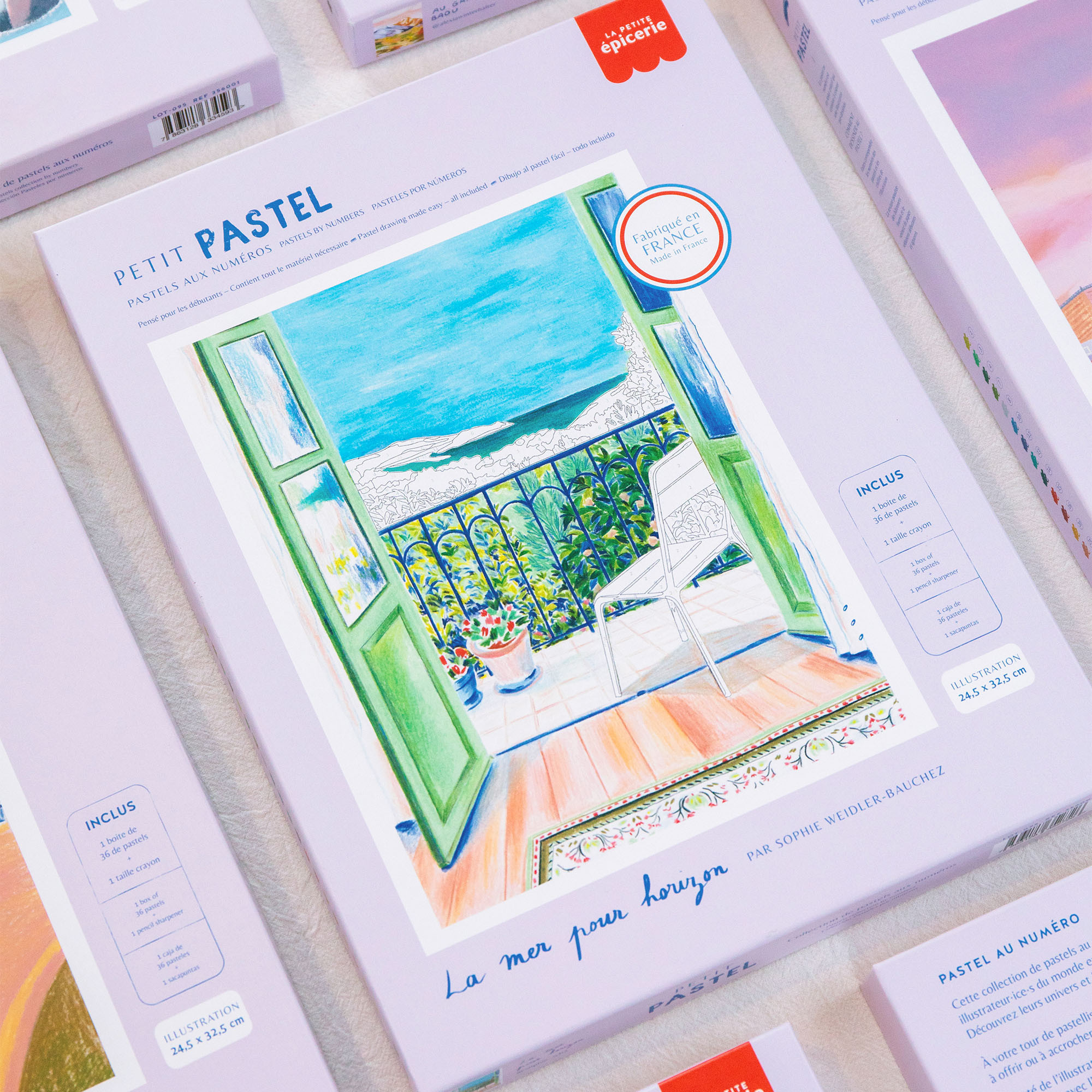 La Petite Épicerie invite à la contemplation avec le kit de pastel aux numéros Petit Pastel – La mer pour horizon, illustré par Sophie Weidler Bauchez et fabriqué en France.