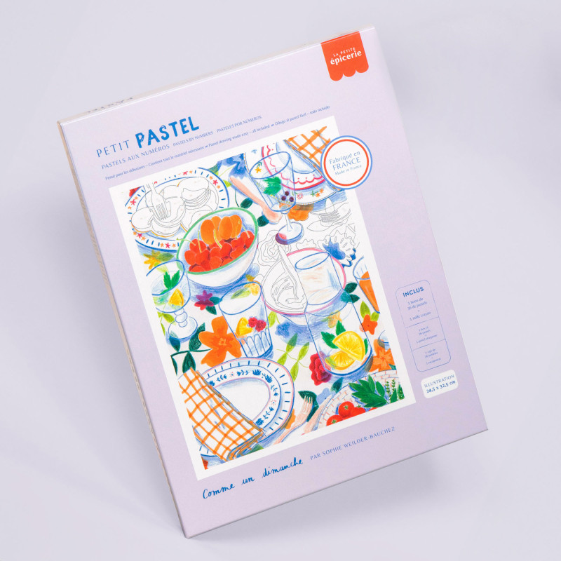 La Petite Épicerie célèbre les petits plaisirs du quotidien avec le kit de pastel aux numéros Petit Pastel – Comme un dimanche, illustré par Sophie Weidler Bauchez et fabriqué en France.